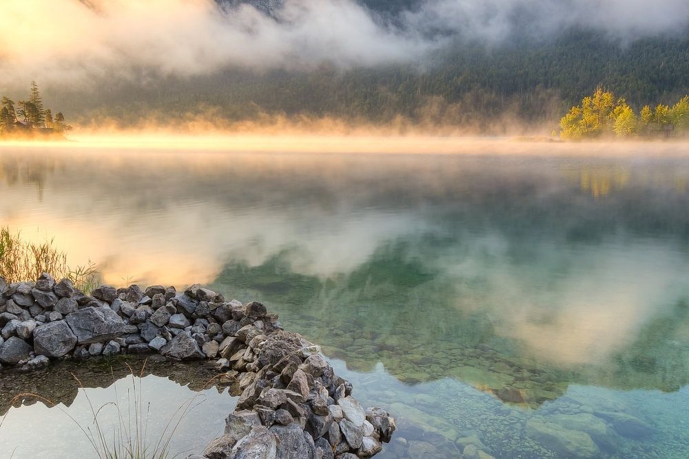 It is autumn at the Eibsee at the foot of the Wettersteingebirge with the Zugspitze as the highest peak. Wafts of fog are wafting across the lake, new fog is constantly forming over the lake, which is bathed in a warm light by the sun's rays.