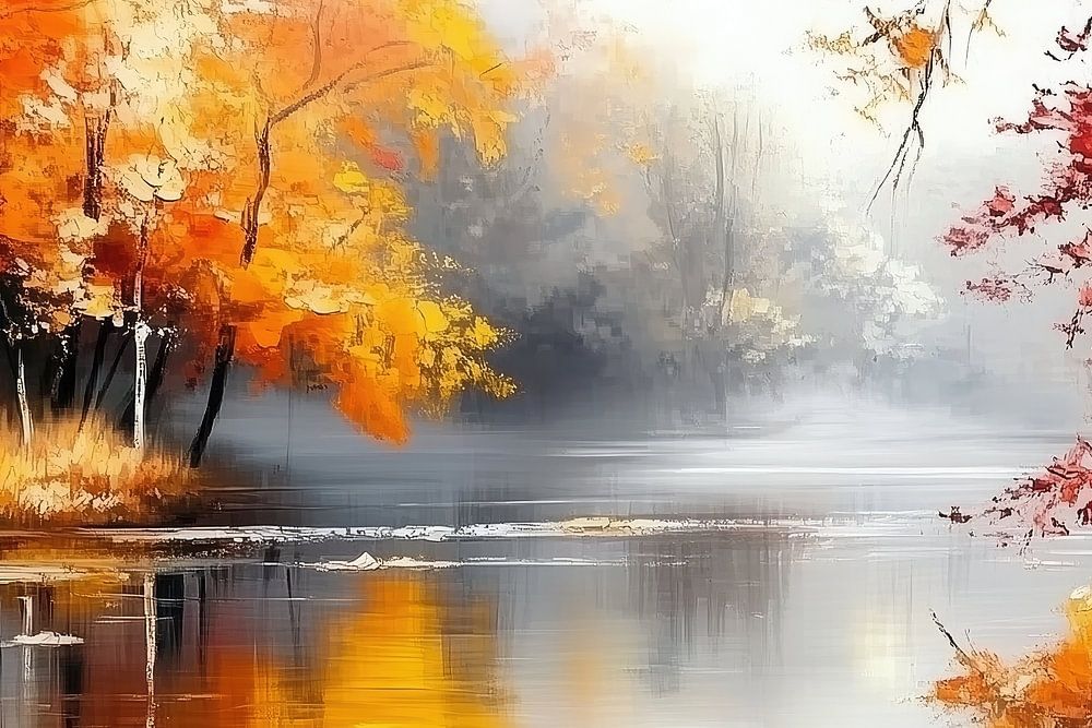 This work depicts a soothing scene in which autumn is at its peak. Warm shades of orange, red and golden yellow dominate the image, while the trees along the still water seem to glow in the soft light of a misty morning. The reflection in the smooth water surface enhances the splendour of colours, as if nature itself holds up a mirror to its own beauty.