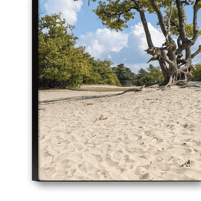 This beautiful distinct oak tree stands in the middle of a very nice sandy area in the forest.