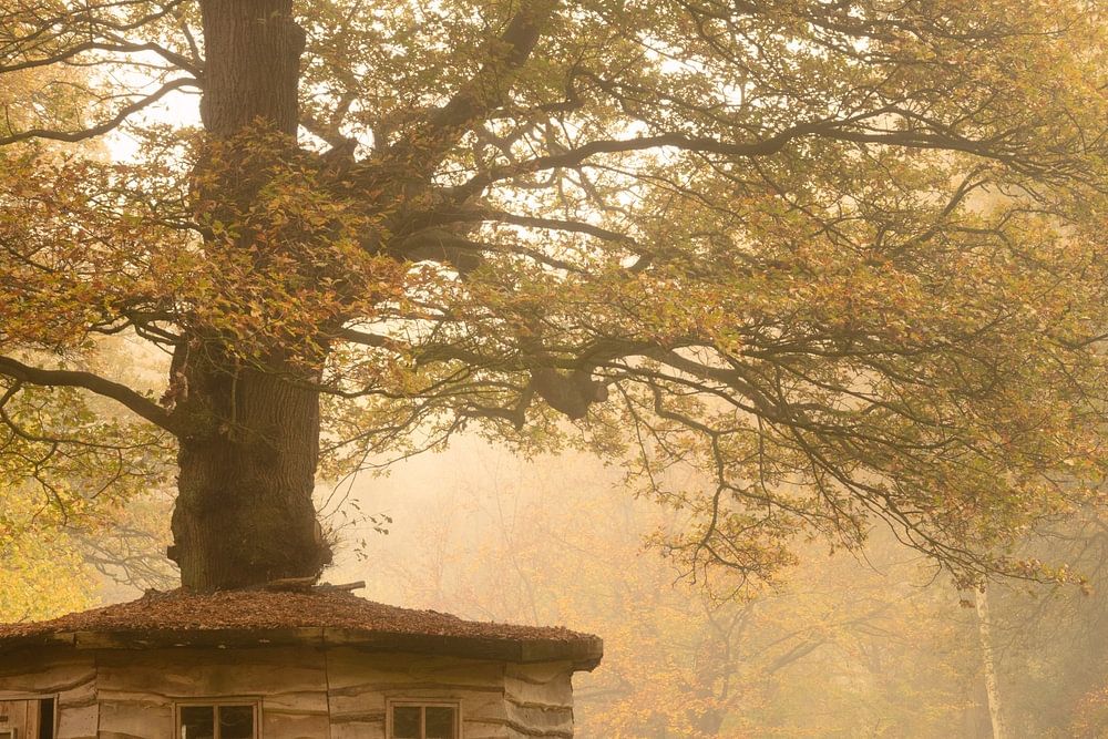Photo of a tree house around a tree, on the Fraeylemaborg estate in Slochteren, Groningen. Fog hangs around the cottage. Which gives the photo a dreamy atmosphere.