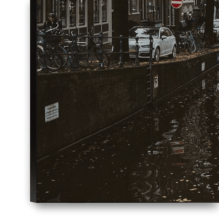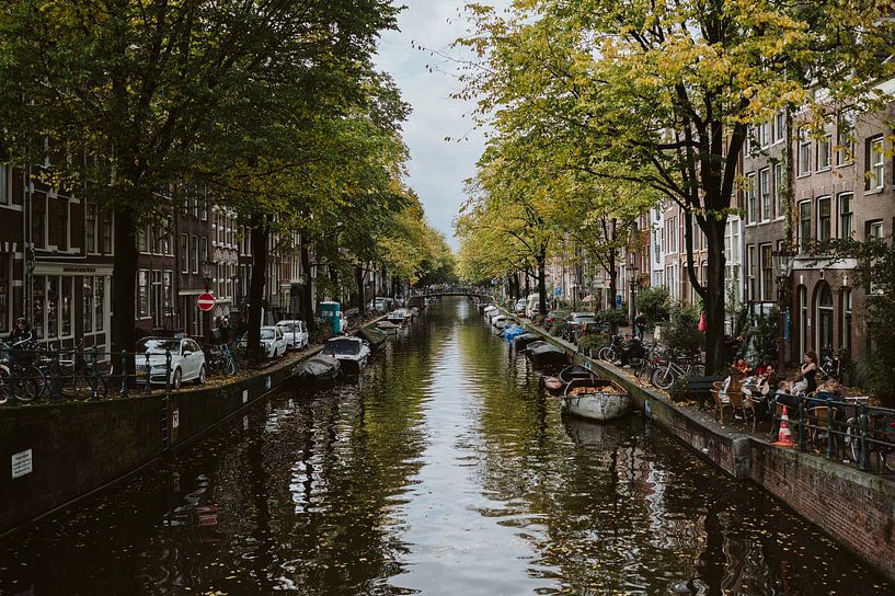 A tranquil Amsterdam canal in autumn, surrounded by stately trees and characteristic canal houses. The falling leaves and soft reflections in the water give the cityscape a warm, timeless atmosphere. Perfect for lovers of urban photography with a natural touch.