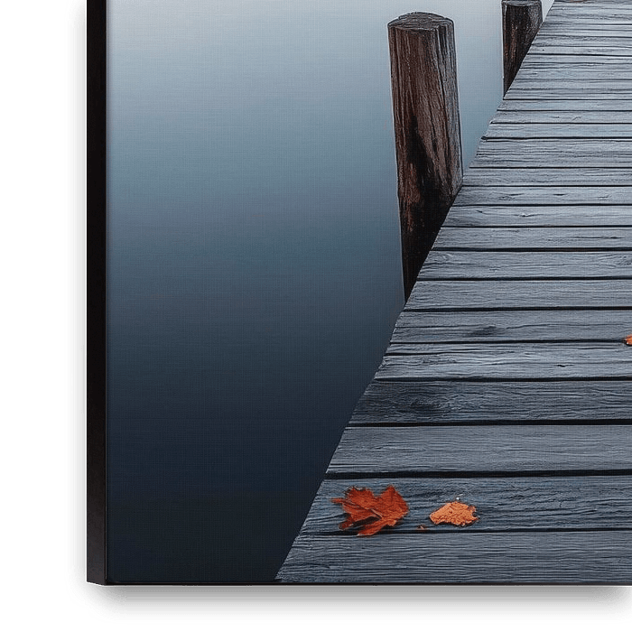 A picturesque footbridge leads gently into the calm water, surrounded by a blazing play of autumnal colours. The mirror-smooth surface reflects the warm tones of nature and invites you to linger. A sense of calm and melancholy pervades the scene, while the golden beauty of autumn beguiles the senses.