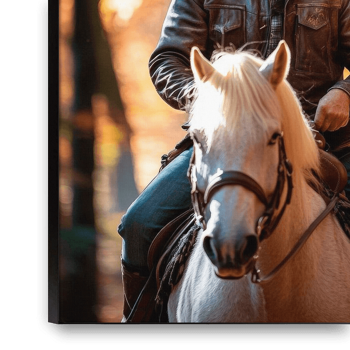 A radiant rider in traditional cowboy gear carves his way through a sea of golden autumn leaves, while the sun shines warmly through the trees. This nostalgic motif full of a sense of adventure and natural beauty harmonises perfectly in a living room, where it tells stories of freedom and vastness.