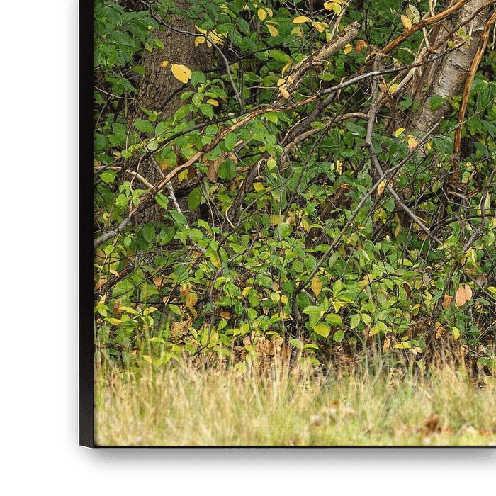 A slight fallow deer buck gracefully reaches out to grab a leaf from a branch - a small gesture full of grace and life. Around him, the leaves colour in warm autumn tones, like a picturesque backdrop. His posture is tense but soft, a moment of natural elegance. This picture captures the poetry of the season and the playful side of wildlife. Perfect as a wall decoration for lovers of autumn light, animals in motion and the beauty of the everyday in nature.