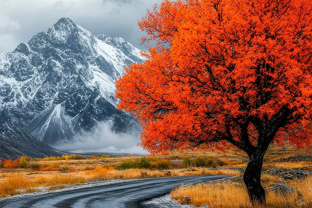 A bright red tree radiates vibrancy against the dramatic backdrop of snow-capped mountains and moody clouds. The winding path invites you to dream and relax. This fascinating scenery lends any living room a harmonious, natural atmosphere and allows the viewer to feel the beauty of nature at all times.