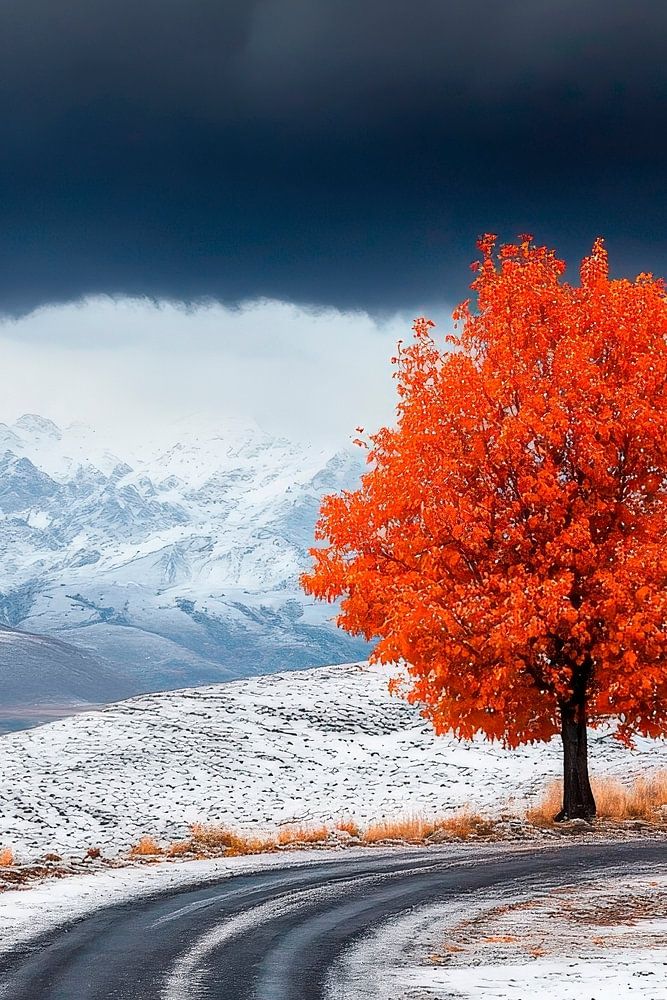 A bright orange tree unfurls its blaze of colour in front of dramatic, dark clouds and snow-covered mountains. The curved path invites dreamy thoughts and nostalgic memories. Perfect for the living room, this picture conveys a harmonious connection to nature and creates an inviting atmosphere that invites you to linger.