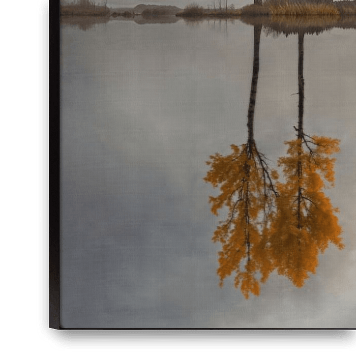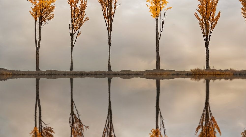 This artwork shows a row of slender trees in full autumnal glory, perfectly aligned along the waterfront and mirrored in the still surface below. The warm autumn colours - from golden yellow to deep rusty brown - contrast subtly with the soft grey tones of sky and water, giving the image a calm and balanced look.