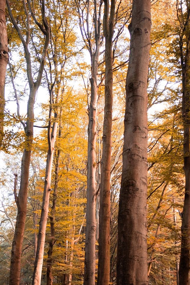 The photograph captures a quiet, atmospheric moment in an autumn forest. Tall, slender trees with straight trunks rise up, their foliage partly discoloured to warm shades of yellow, orange and red. Low sunlight filters through the foliage, casting a soft glow over the trunks and the leaf-covered forest floor. The silence is almost palpable - broken only by the suggestion of falling leaves or creaking branches. The composition emphasises vertical lines and depth, evoking a sense of serenity and endlessness. A perfect representation of the stillness and beauty of autumn.