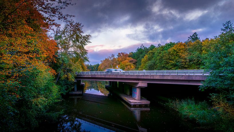 Beautiful autumn colours in this photo of a viaduct across the autumn forest. The photo was taken just after sunset because of this the clouds still glowed a little in a soft pink colour at the edge.
