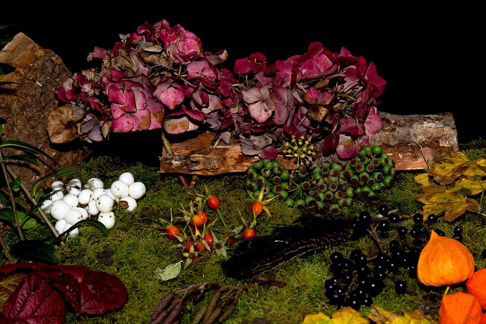 In autumn you can find all kinds of seed pods, berries and beautifully coloured balders. All this is stylized into a still life.