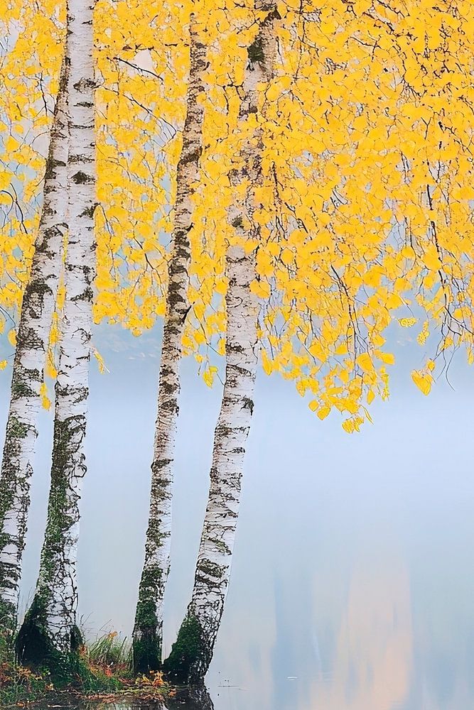 Radiant, golden birch trees rise majestically above a mist-shrouded lake, their shimmering reflections dancing gently on the surface of the water. This harmonious image of nature brings peace and serenity to the living room or bedroom, creating a perfect retreat and inviting you to dream and relax.
