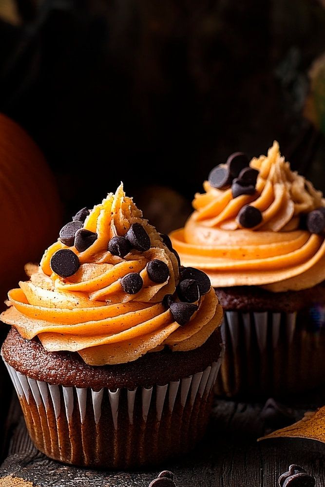 In an autumnal setting, these chocolate cupcakes with orange buttercream and a dash of chocolate shine like little works of art. Surrounded by golden leaves and a glowing pumpkin, they create a warm, inviting atmosphere. Perfect for the kitchen, where they awaken the senses and invite you to linger!