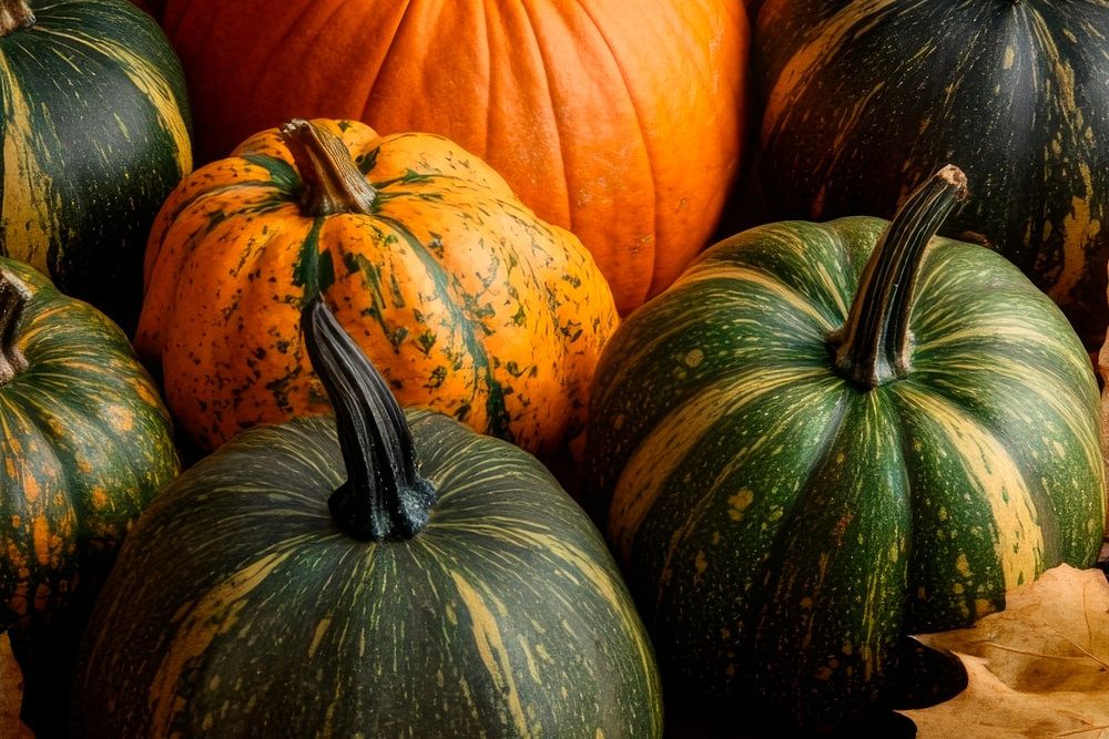 Colourful pumpkins appear in the midst of golden autumn leaves, a vibrant interplay of rich orange and deep green. The different shapes and sizes invite you to marvel, while their rustic charm embodies the gentle warmth of autumn. A quiet celebration of the harvest that enchants the senses and invites you to dream.
