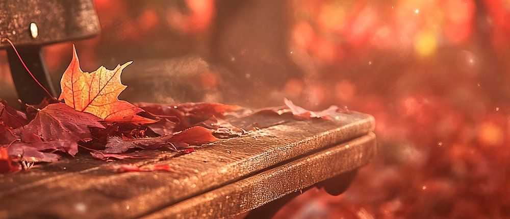 Gentle rays of light break through the autumn leaves and lend this scene a warm, inviting atmosphere. An orphaned wooden table covered in bright red and golden leaves invites you to pause and savour the beauty of nature. Ideal for the living room to create a cosy atmosphere and evoke memories of relaxed autumn days.