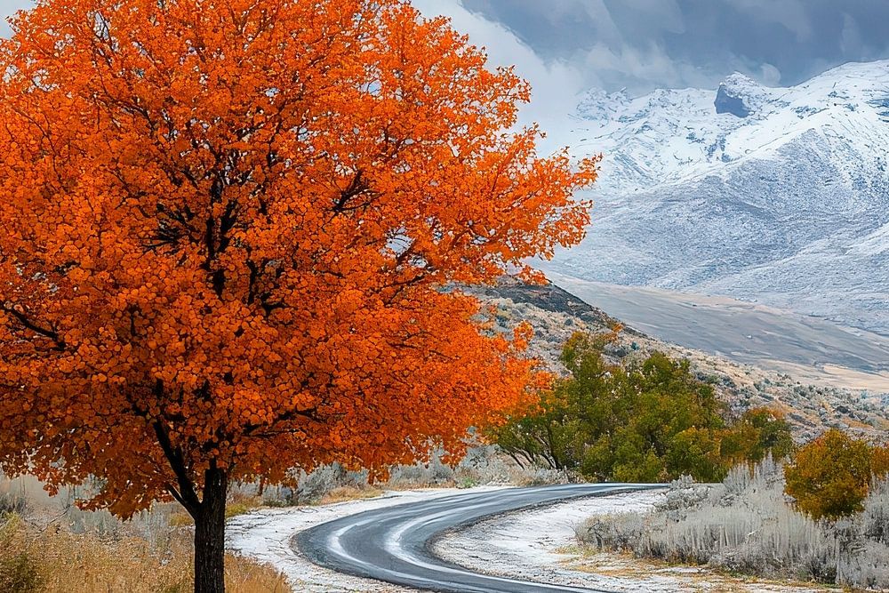 A bright orange tree stands majestically by the wayside, surrounded by rolling hills and snow-capped mountains, while dramatic clouds dominate the celestial backdrop. This vibrant scene brings the colours of autumn into play and adds an inviting, cosy atmosphere to any living room. A perfect eye-catcher for nature lovers!