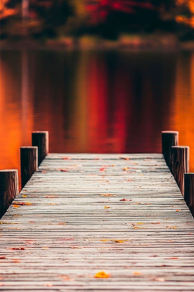 A picturesque footbridge that gently merges into a reflective lake, framed by bright orange and golden autumn leaves. The harmonious interplay of nature and water invites calm and contemplation. Perfect for the living room to create a warm, inviting atmosphere and encourage daydreams.