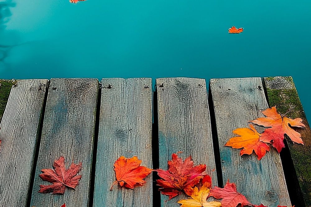 An idyllic moment in which bright orange and red leaves float gently on the surface of the water. The old wooden jetty is inviting and conveys a sense of calm. A perfect accent for the living room, where this relaxing view brings the autumn mood into every room and inspires dreaming.