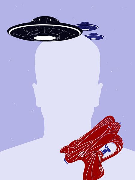 The graphic shows a surrealistic scene in which a large, bright avatar is flown over by UFOs, while a red, retro-futuristic toy water pistol is placed in the foreground.
