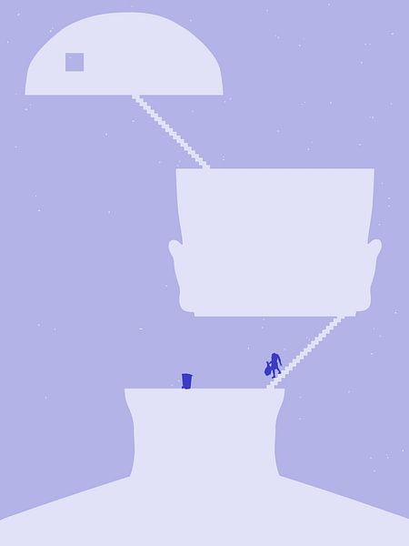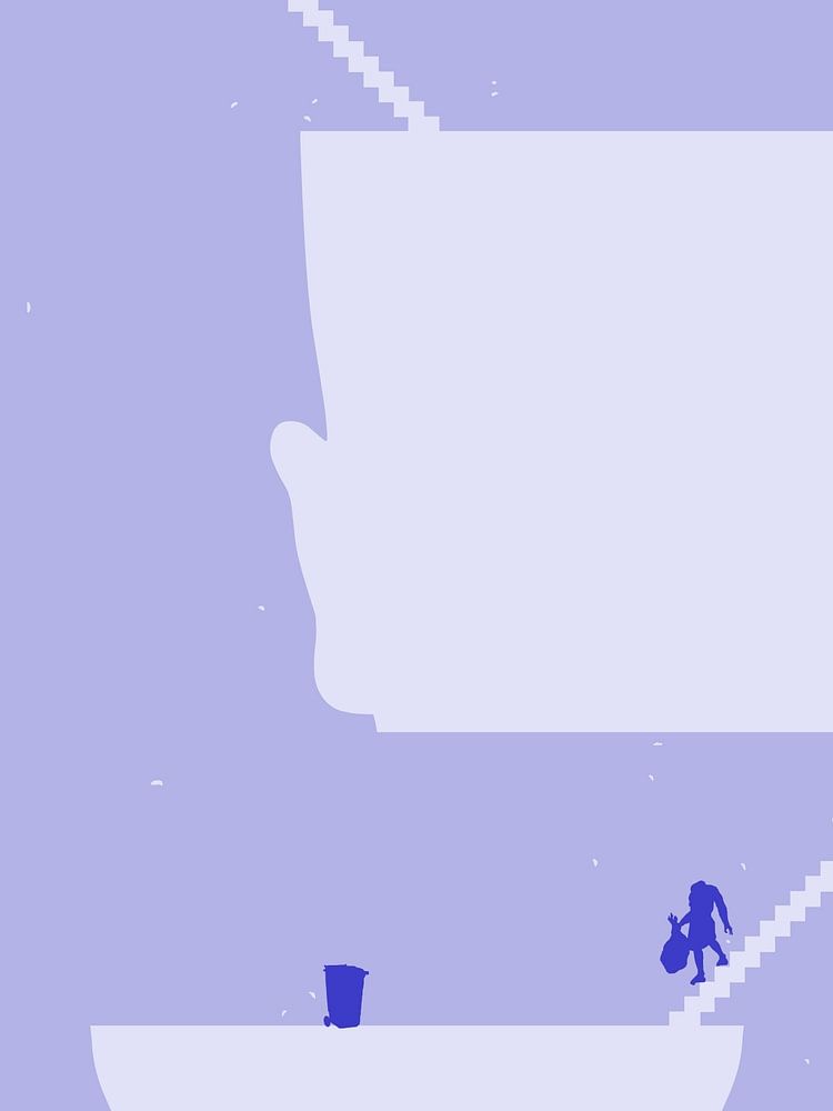The digital illustration shows a standard avatar from the Internet, which is divided horizontally into three parts that are connected by steps. A square window is indicated in the upper part of the head. On the lowest steps, the silhouette of a woman wearily carries a bin liner down to a rubbish bin waiting on the first…