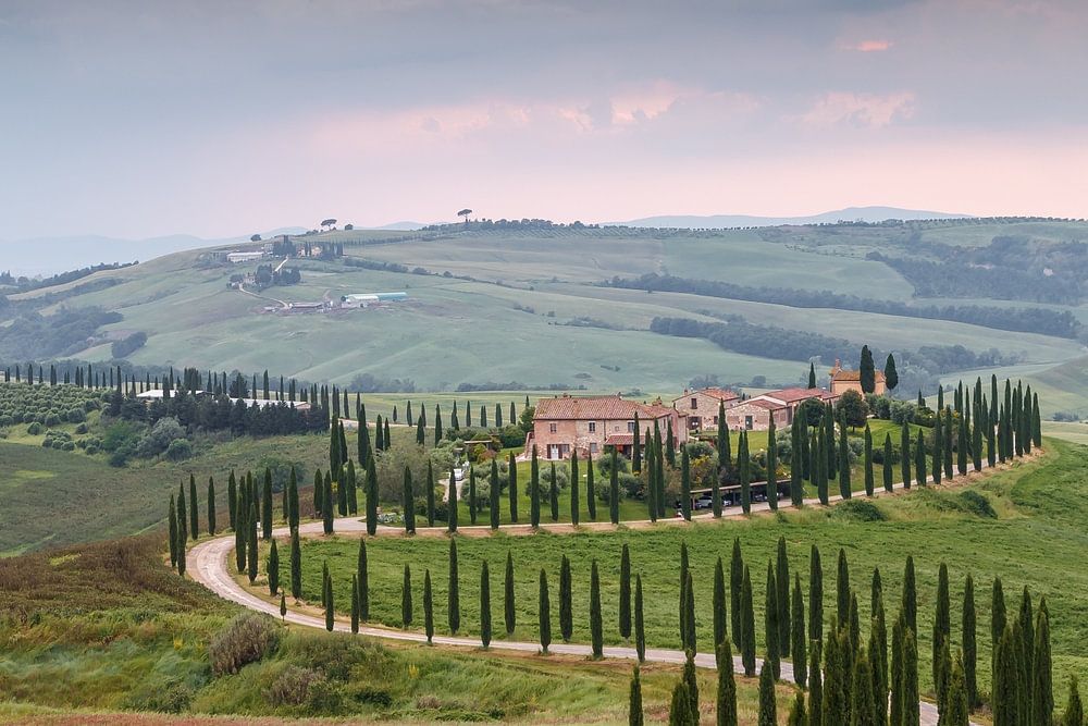 A beautiful winding avenue of cypress trees leading to an Agriturismo a converted farmhouse where you can sleep. The sunset after a big thunderstorm completes the picture.