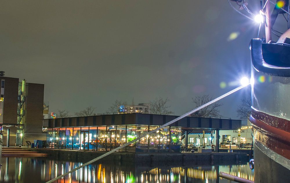 De nieuwe Piushaven middenpier en Restaurant RAK ook mooi in de avond met lichtjes en waterspiegeling in het water.