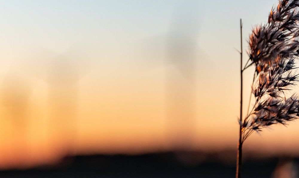 Een close-up beeld van grassen in het warme licht van de ondergaande zon op Walcheren