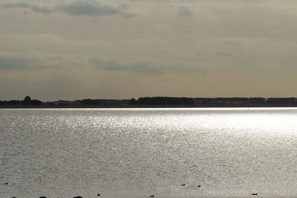 Avondzon op het water met aan de linkerzijde een silhouet van een zeilboot, dit alles tegen zonsondergang