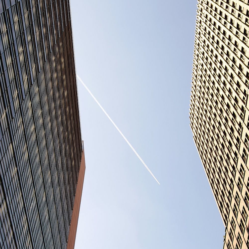 Photo of some office towers at Berlin's Potsdamer Platz, Germany. I only slightly reworked the shot of the skyscrapers and the passing aeroplane afterwards. Potsdamer Platz is also one of Berlin's landmarks.