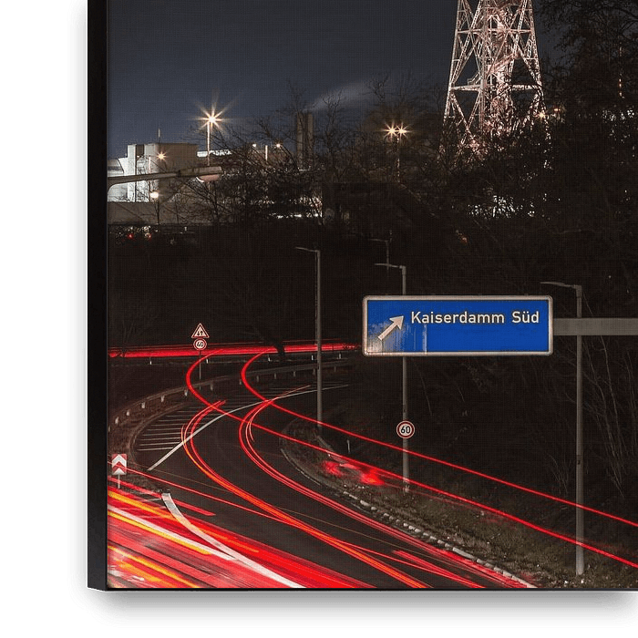 The illuminated Berlin Radio Tower rises majestically into the dark night sky, forming an impressive contrast to the flowing red light trails of traffic on the A100, the city highway, at the Kaiserdamm exit. The long exposure lends the scene dynamism and urban pulse, while the clear architecture of the tower radiates calm and stability.…
