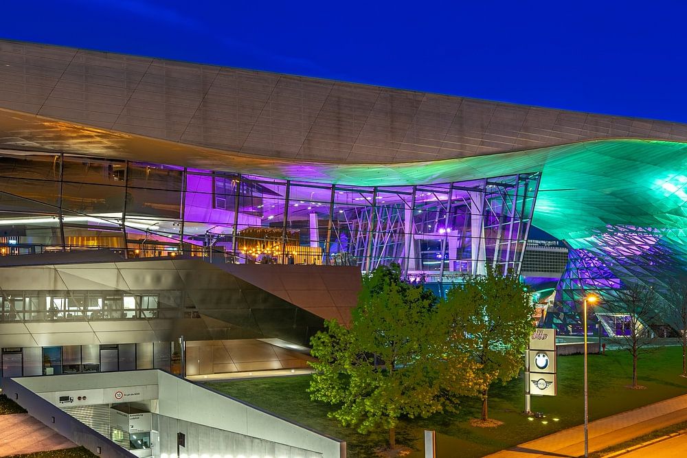 BMW Welt with the BMW AG administration building in the background in the blue hour.