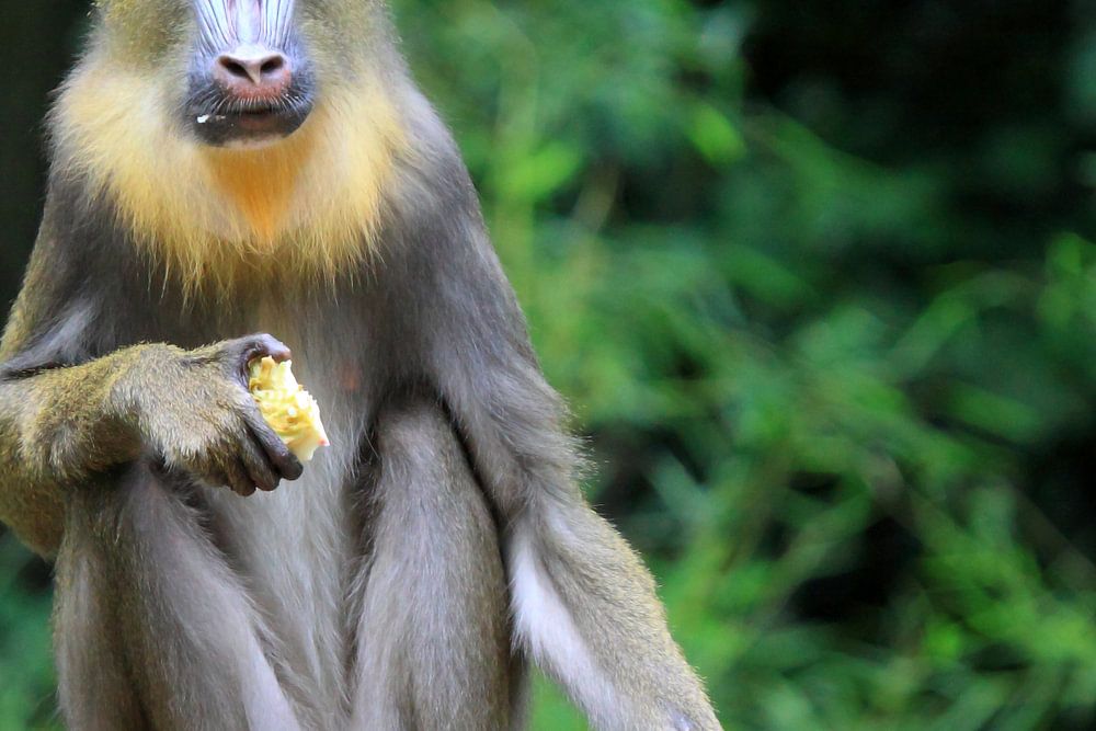 Veel groente en fruit eten is gezond en dat weet deze baardaap ook. Lekker zit ze dan ook op de boomstam van haar groentehapje te genieten. Speciaal voor in de eetkamer, of in de keuken en zeker ook voor in de kinderkamer is dit een passende beeld. Want het motto is 'zien eten doet eten',... daar krijg je toch honger van.