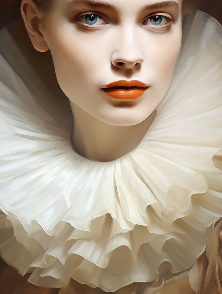 Portrait of a young woman with red updo hair wearing a gold silk dress with a large double pleated collar.