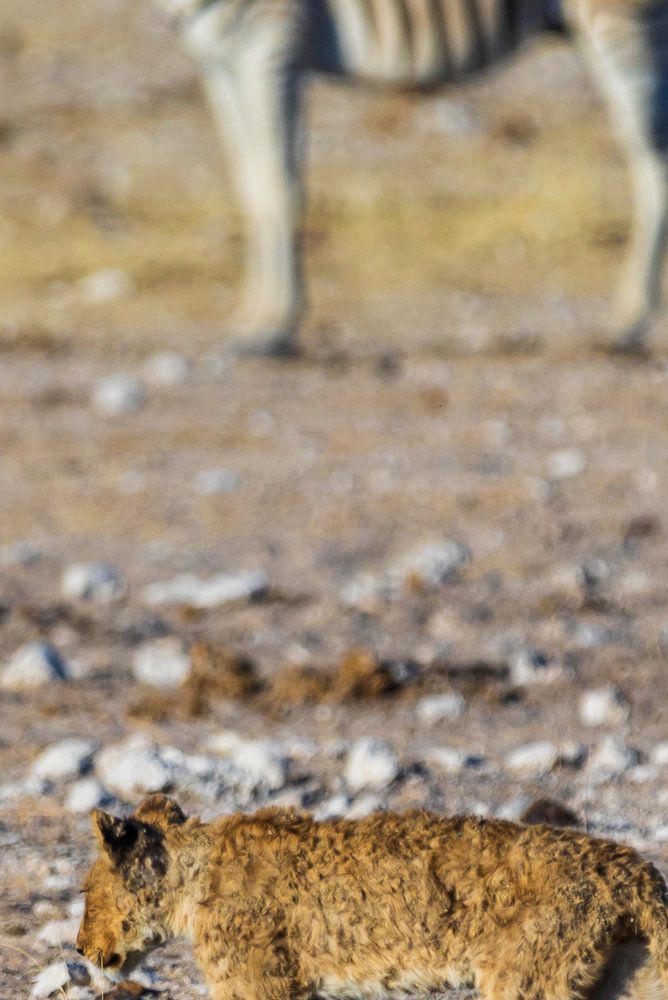 A baby lion looking for prey. A motif for Africa or Safari fans. In the background a zebra