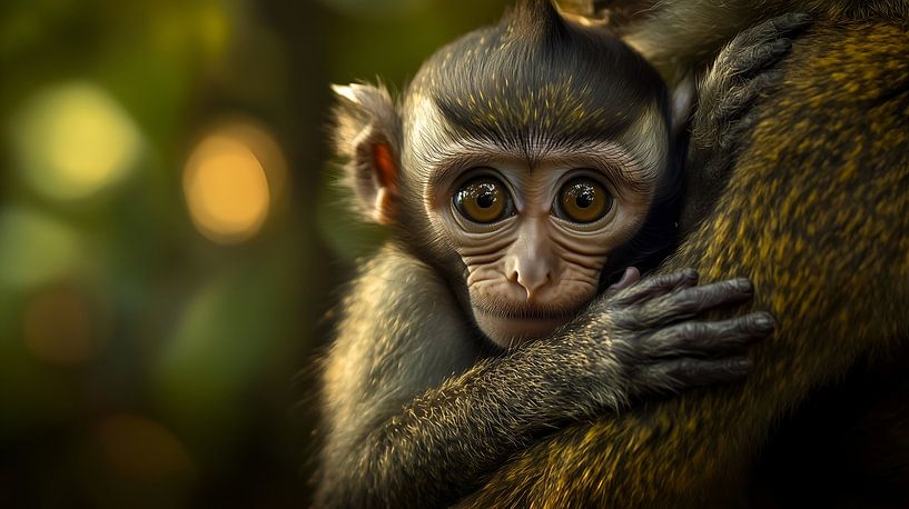 A close-up image of a baby monkey clinging tightly to its mother in the jungle. The baby’s wide eyes reflect a sense of innocence, curiosity, and security, emphasizing the close bond between the young and its caregiver. The soft focus on the background enhances the detailed textures of the baby’s fur and tiny hands, while the natural…