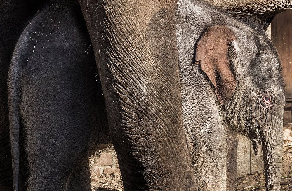 This baby elephant is only nine days old, safe between the legs of his mother, he carefully explores the world. It is a beautiful day, the sun is shining and he is standing there in the sun. A wonderful new life, this fragile baby elephant.