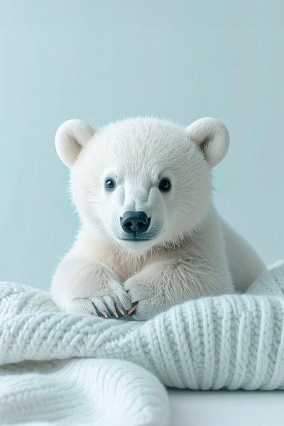 An adorable baby polar bear, white and fluffy with small round ears and dark eyes and nose. He is lying on a chunky knitted light blue woollen blanket, and the background is also light blue. It exudes a fresh winter atmosphere, just what polar bears love. The image was generated using AI.
