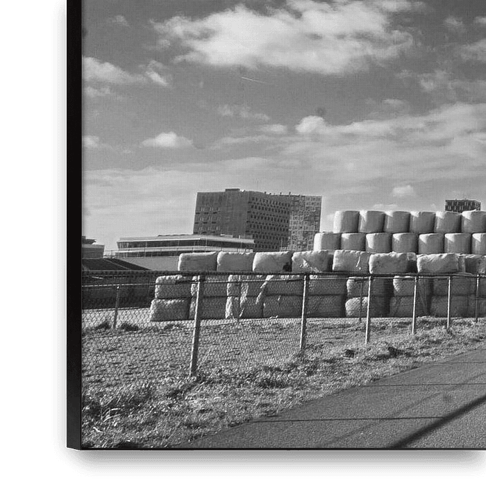 City landscape but from the back. From where you don't often look at a city. On cycling trips, I try to encounter as little traffic as possible and this is one of those places I then pass and it integrates me. Human tracks all around but without people. Who works here and what do they do? Black and white 16mm and a low viewpoint is…
