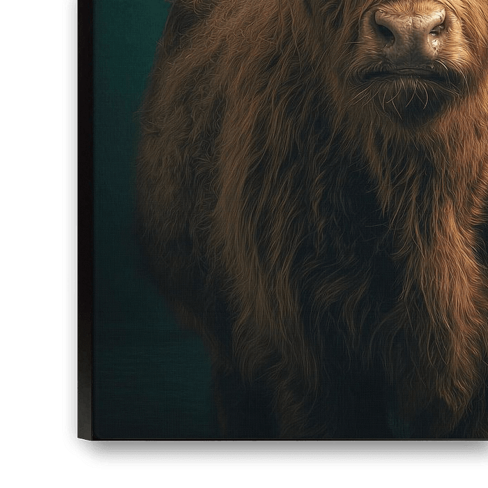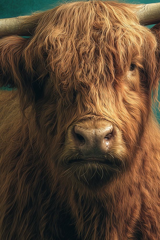 A fluffy highlander looks straight into the camera with a look that says he knows exactly how impressive his hair is. Tough, soft and comical at the same time.
