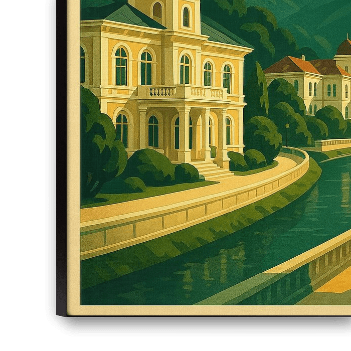This vintage-inspired Art Deco poster celebrates Bad Ischl, a famous spa town in Austria surrounded by dramatic Alpine peaks. Known for its historic villas, cultural heritage, and serene landscapes, Bad Ischl is beautifully illustrated here with refined details and bold retro colors. The artwork portrays elegant architecture along the river, framed by majestic mountains under radiant sunbeams. Its composition combines nostalgia with sophistication, making it a perfect piece for collectors of vintage travel posters. Ideal as wall art for your home, studio, or office, this print evokes the romance and elegance of Austria’s imperial spa tradition. It’s also a meaningful gift for anyone who appreciates Austrian history, architecture, or simply the beauty of Alpine landscapes. This Art Deco design not only brings visual charm but also adds a warm, inspiring mood to your walls – blending travel passion, classic aesthetics, and timeless artistic style.