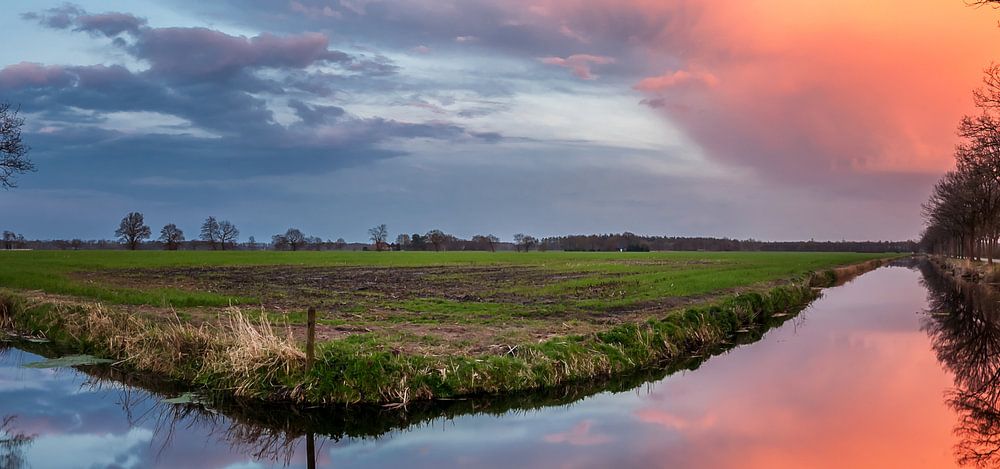 Water feature with a brightly coloured cloud at the end of the tree row during sunset