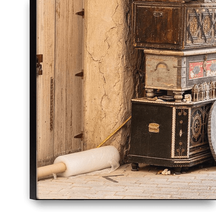 This image shows a quiet corner where objects have piled on top of each other, so to speak. Old wooden crates, metal cases and handmade boxes form a vertical composition against a weathered wall. Each object bears its own traces of use: scratches, patina and discolouration that testify to time and travel. The soft earth tones of the…