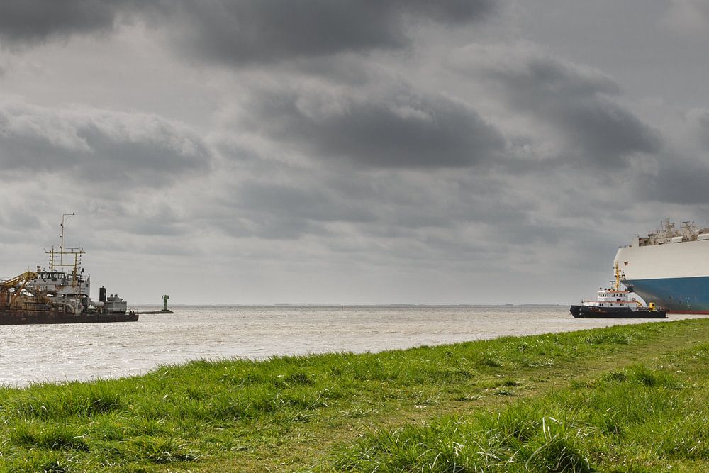 Baggerschiff und Autofähre im Außenhafen von Emden.