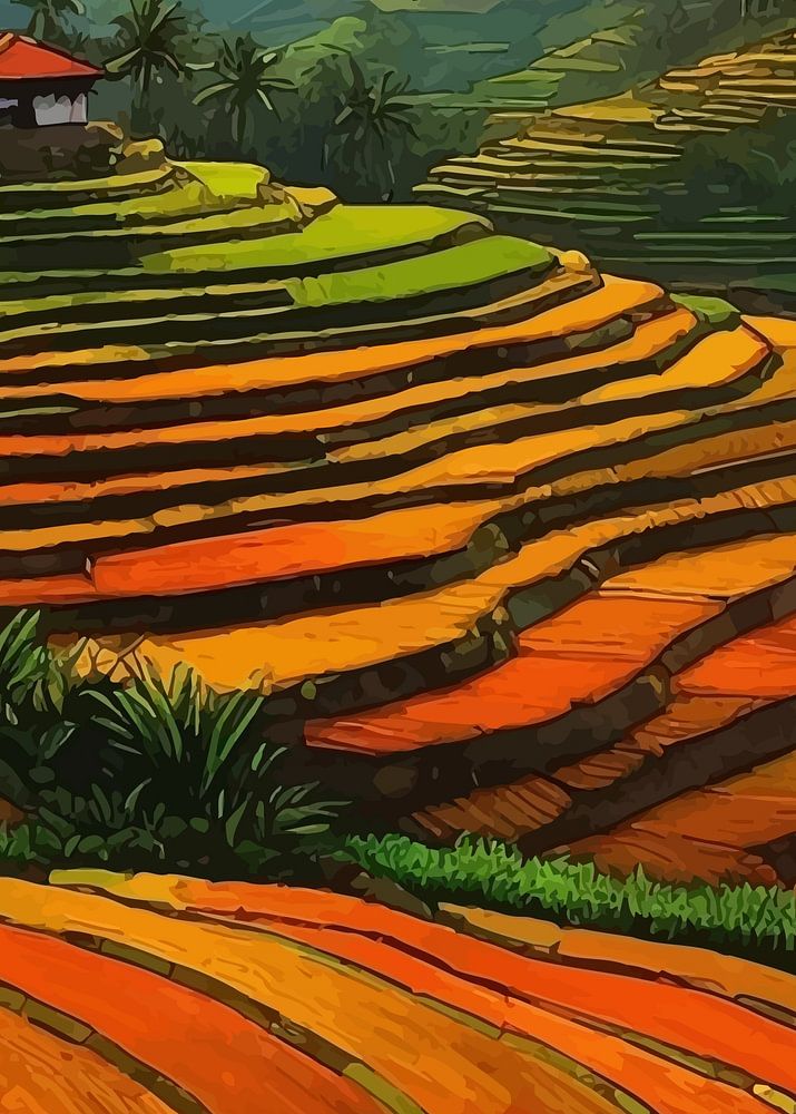 This oil pastel abstract brings the Bali rice terraces to life at sunrise, where stepped fields transform into flowing painterly impressions. Gentle layers of texture rise and curve across the canvas, echoing the rhythm of the land as morning light awakens the horizon. Splatter elements shimmer like the first sparkles of dew, adding vitality to the serenity. The abstraction captures not just a place, but a feeling of renewal and balance. Ideal for interiors seeking harmony and beauty, this artwork offers a meditative connection between nature and artistry.