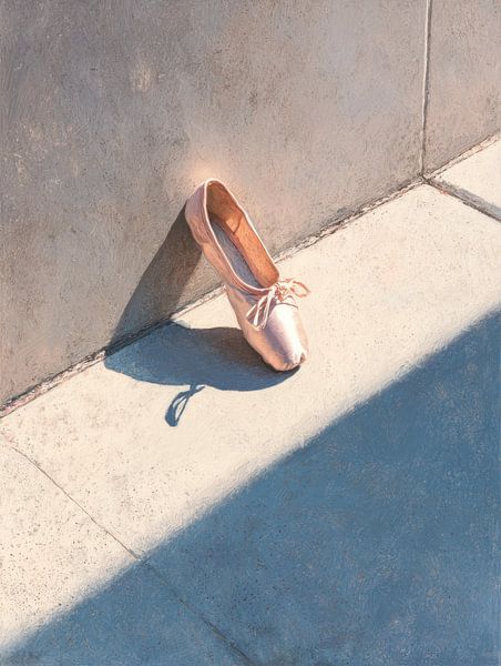 A ballet shoe rests against a hard edge. The soft texture of the ribbon and leather contrasts with the rough surroundings. The sculpture speaks of discipline, vulnerability and abandoned movement.