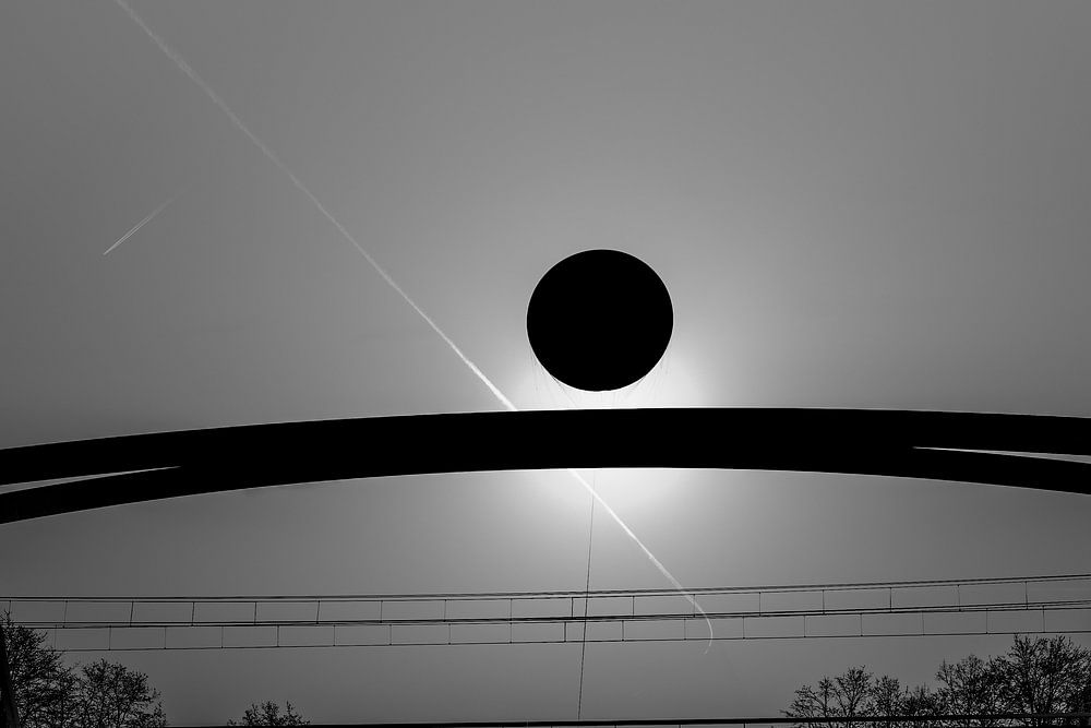 The sun was just behind the Generali balloon that brings tourists up to 300m. Right on top of the bridge and a plane crosses it.