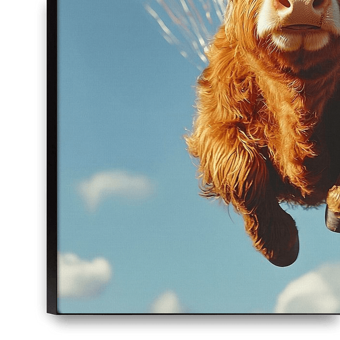 Buy this highland cow art Balloon ride with the Highlander by But First Framing on canvas, ArtFrame, poster and wallpaper, printed on demand in high quality.