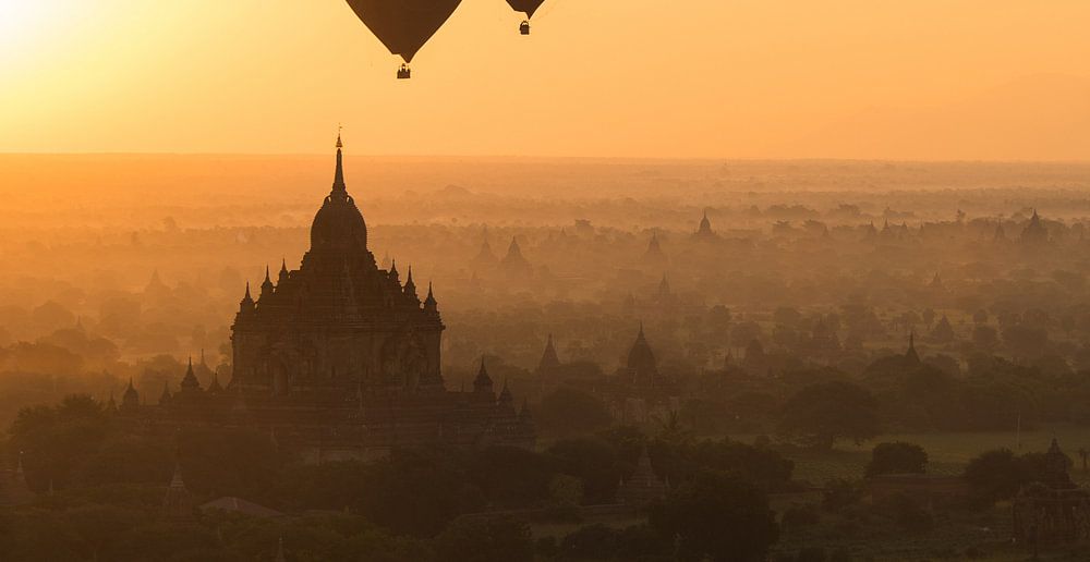 This picture is taken around 7 o'clock in the morning, from a hot air balloon above Bagan, Myanmar.