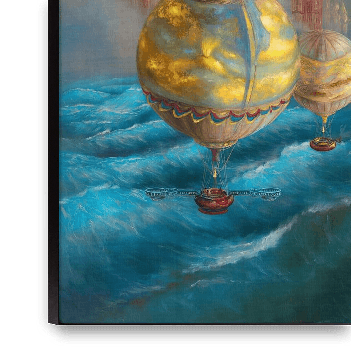 Each balloon in the drawing has fantastic drawings and flies under the illustration of the moon over the waves near an Arab-looking fortress.