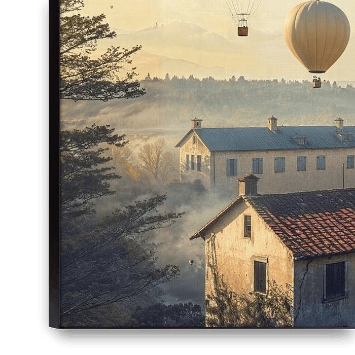 In "Balloons in the Morning Mist", I capture the magic of a new beginning. The work shows a group of hot air balloons floating gracefully above an idyllic village, enveloped in the first patches of morning fog. The warm hues of the houses and soft morning light create an almost dreamlike atmosphere, while the balloons fill the sky like…