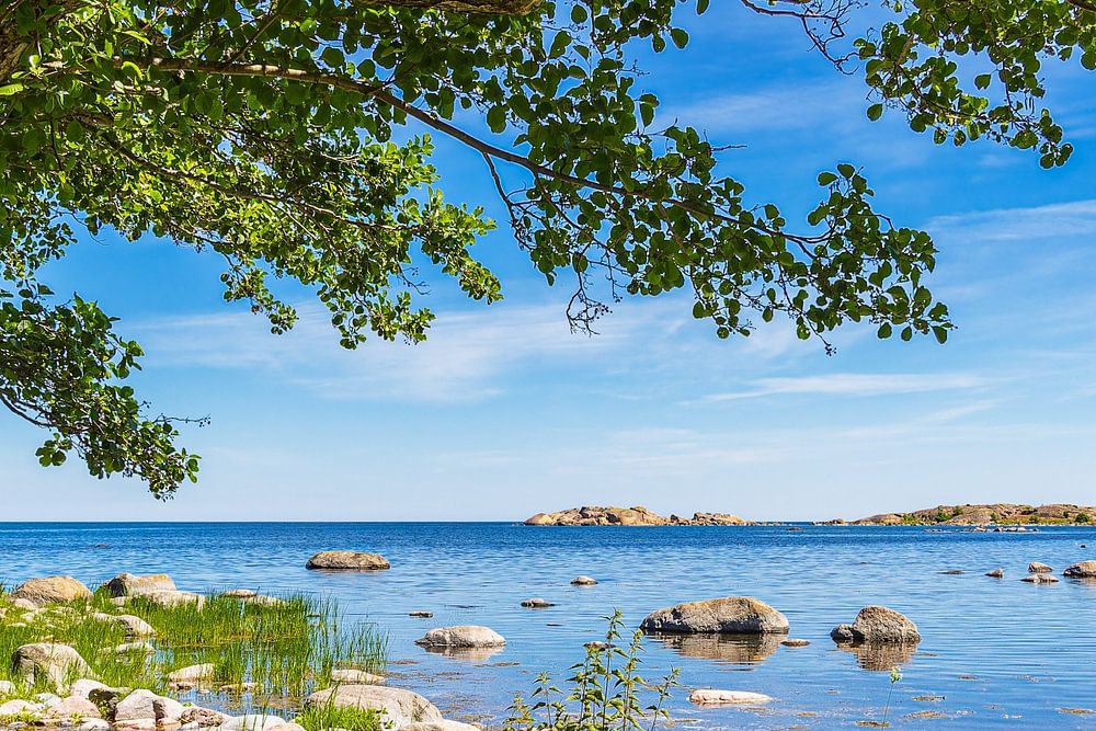 Baltic Sea coast with rocks and tree on the island of Sladö in Sweden.